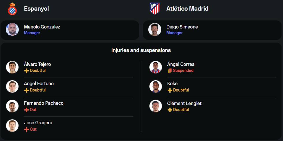 ฝั่งเจ้าบ้าน เอสปันญ่อล ของกุนซือ มานูเอล กอนซาเลซ จะได้กองกลางตัวเก่งอย่าง ปอล โลซาโน่ พ้นโทษแบนกลับมาประจำการอีกครั้ง ขณะที่แนวรับยังไม่มี เฟร์นานโด ปาเชโก้ กับ โฆเซ่ กราเกร่า ที่ยังเดี้ยงเช่นเดิม เกมนี้จะมาในระบบ 4-4-2 วาง อเล็กซ์ คราล จับคู่กับ โรเบร์โต้ เฟร์นานเดซ ในแดนหน้า โดยมีแนวรับอย่าง กาเบรร่า และ คุมบุลล่า คุมหลังบ้าน