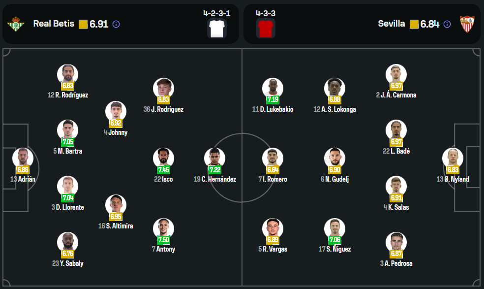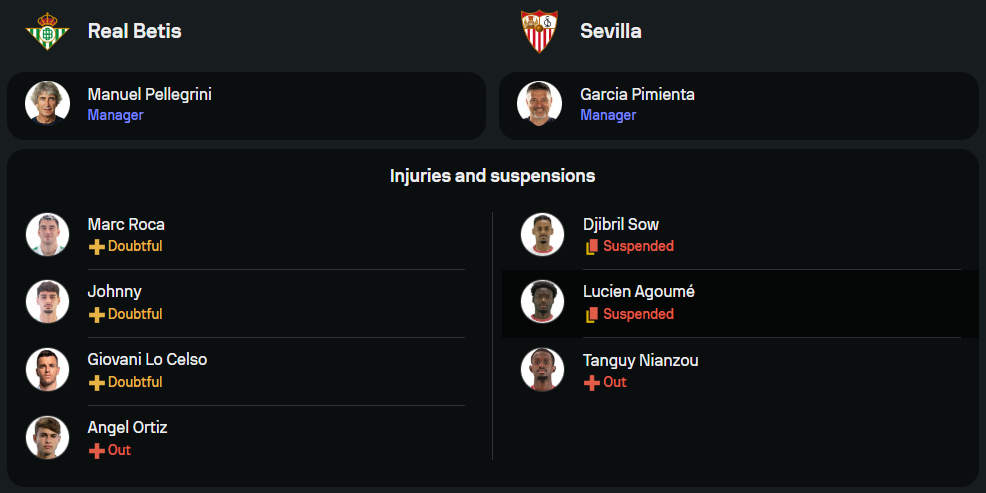 ลูกทีมของ มานูเอล เปเยกรินี่ อยู่ในสภาพที่เรียกได้ว่าเกือบสมบูรณ์ ตัวเจ็บเพียงรายเดียวคือ มาร์ก โรก้า กองกลางคนสำคัญที่ยังต้องลุ้นความฟิต ส่วน จอนนี่ การ์โดโซ่ พ้นโทษแบนกลับมาประจำแดนกลางทันเวลา ระบบ 4-2-3-1 ถูกใช้ต่อเนื่อง โดยมี ชูโช่ ยืนหน้าเป้า ขนาบด้วย อันโตนี่ และ เฆซุส โรดริเกซ ที่กำลังท็อปฟอร์ม ขณะที่ อิสโก้ ยังคงเป็นจอมทัพสร้างสรรค์เกมจากแดนกลางอย่างไม่เปลี่ยนแปลง