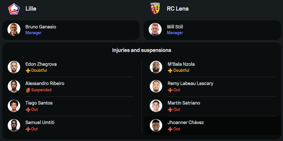 ลีลล์ ของกุนซือ บรูโน่ เชเนซิโอ กำลังเผชิญกับปัญหาผู้เล่นบาดเจ็บและติดโทษแบน โดยเฉพาะแนวรับและปีกที่ขาดไปหลายราย ทั้ง ซามูแอล อุมติตี้, ติอาโก้ ซานโต๊ส, และ อเล็กซานโดร ริเบยโร่ ส่วนฝั่งเกมรุกยังฝากความหวังไว้ที่ โจนาธาน ดาวิด กองหน้าตัวเก่งที่ยิงไปแล้ว 14 ลูกในลีกปีนี้ โดยมี ฮาคอน ฮารัลด์สสัน, โอซาเม่ ซาห์ราวี และ กาเบลล่า คอยหนุนหลังในระบบ 4-2-3-1