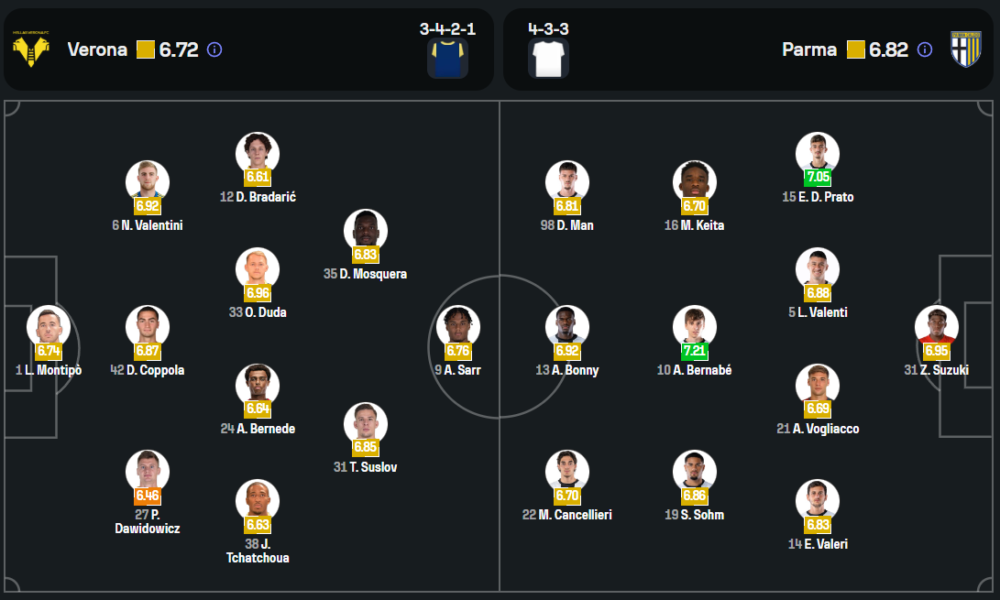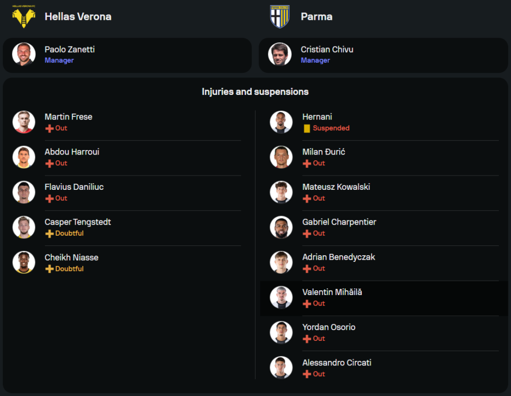 ฟากผู้มาเยือน ปาร์ม่า ของกุนซือ คริสเตียน คิวู ยังไม่มีชื่อของ เอร์นานี่ ที่ติดโทษแบน แต่จะได้สองตัวหลักอย่าง ไซมอน โซม และอเลสซานโดร โวญัคโค่ กลับมาประจำการอีกครั้ง เช่นเดียวกับ มัตเตโอ กันเชลเลียรี่ ที่หายเจ็บและพร้อมออกสตาร์ท เกมนี้พวกเขาจะเดินหมากในระบบ 4-3-3 โดยมี อาเดรียน เบร์นาเบ้ เป็นแม่ทัพกลางสนาม ป้อนบอลให้สามประสานแนวรุก เดนนิส มัน, โยอัน บอนนี่ และกันเชลเลียรี่ ที่พร้อมสาดใส่แนวรับเวโรน่าแบบไม่ปรานี