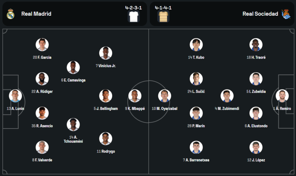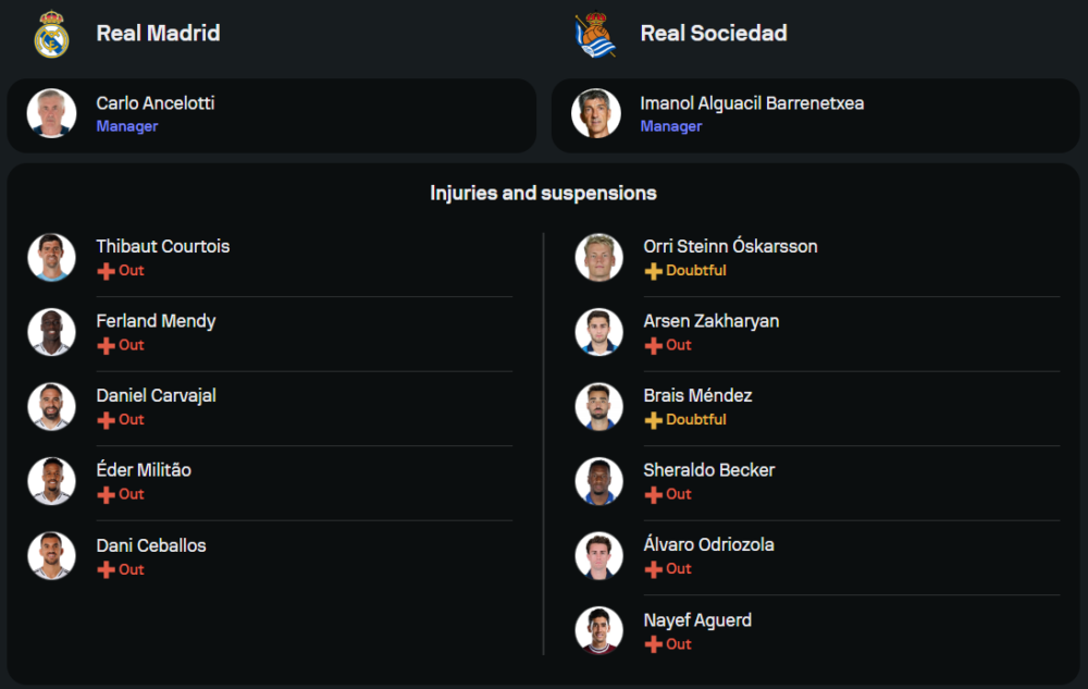 เรอัล มาดริด ยังคงเผชิญปัญหาผู้เล่นบาดเจ็บอยู่หลายราย โดยเฉพาะแผงหลังที่ต้องขาดทั้ง แฟร์ล็อง เมนดี้, ดานี่ การ์บาฆาล, เอแดร์ มิลิเตา และ เฆซุส บาเยโฆ่ ส่วนแดนกลางก็ไม่มี ดานี่ เซบายอส อย่างไรก็ตาม คาร์โล อันเชล็อตติ ยังมีขุมกำลังหลักให้ใช้งานเพียบ จู๊ด เบลลิงแฮม กับ คิเลียน เอ็มบัปเป้ พร้อมลงล่าตาข่ายร่วมกับ วินิซิอุส จูเนียร์ และ โรดรีโก้ โดยมี ออเรเลียง ชูอาเมนี่ คุมเกมแดนกลาง