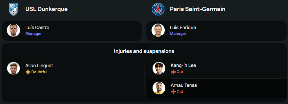 หลุยส์ เอ็นริเก้ ยิ้มรอหลังทีมฟูลทีมเกือบทุกตำแหน่ง ขาดเพียง คัง อิน ลี และ อาร์เนา เตนาส ที่บาดเจ็บ เกมนี้น่าจะจัดทัพเน้นเกมรุกเต็มพิกัดด้วยแผน 4-3-3 โดยมี กอนซาโล่ รามอส ที่กดไปแล้ว 5 ประตูในรายการนี้ รับหน้าที่หน้าเป้าร่วมกับ ควิช่า ควารัตสเคเลีย และ เดซิเร่ ดูเอ้ แดนกลางส่ง ฟาเบียน รุยซ์, วิตินญ่า และ เจา เนเวส คุมเกม ขณะที่แผงหลังใช้ เบรัลโด้, ปาโช่, ฮาคิมี่ และ แอร์กน็องเดซ คอยประคอง