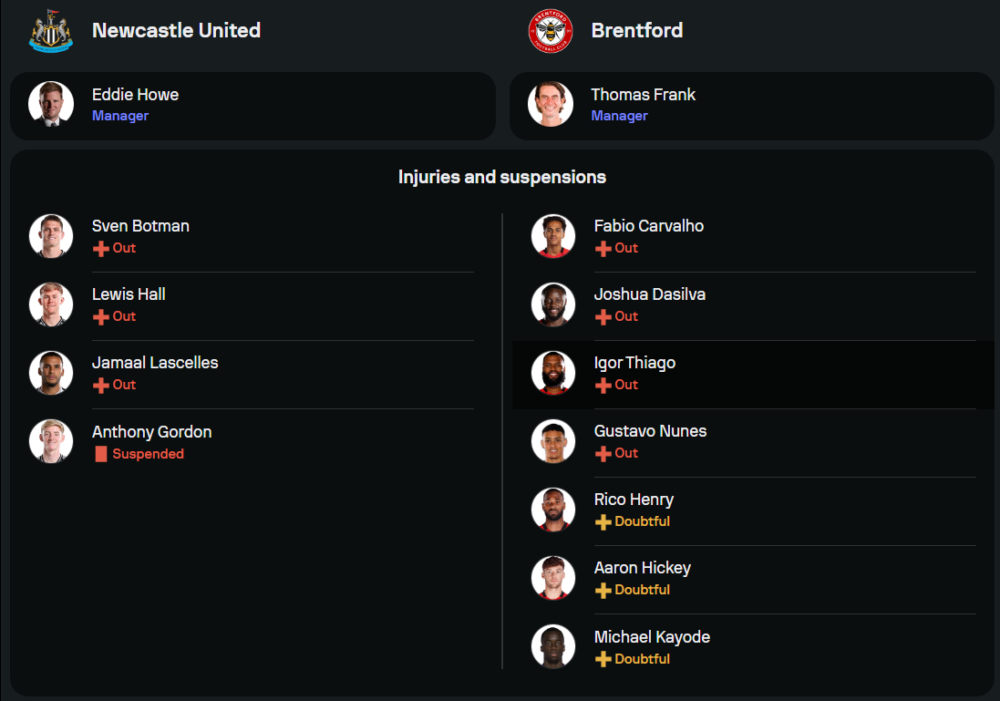นิวคาสเซิ่ล ยูไนเต็ด ของกุนซือจอมวางแผน เอ็ดดี้ ฮาว ต้องเจอกับปัญหานักเตะบาดเจ็บและติดโทษแบนเล่นงานอย่างต่อเนื่อง โดยเฉพาะแนวรับที่เสียทั้ง สเวน บ็อตมัน, ลูอิส ฮอลล์ และ จามาล ลาสเซลล์ส ขณะที่แนวรุกก็หมดสิทธิ์ใช้งาน แอนโธนี่ กอร์ดอน ที่ติดโทษแบน ส่งผลให้แนวรุกต้องฝากความหวังไว้กับ อิซัค, เมอร์ฟี่ และ บาร์นส์ ที่จะเป็นสามประสานในระบบ 4-3-3 โดยมี ซานโดร โตนาลี่ คุมเกมกลางสนามอย่างเข้มข้น