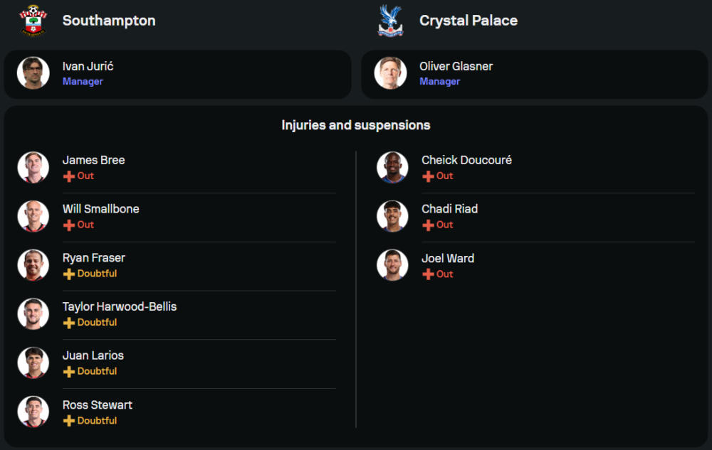ทีมเยือนภายใต้การคุมทีมของ โอลิเวอร์ กลาสเนอร์ ฟอร์มกำลังร้อนแรงแบบฉุดไม่อยู่ และยังมีข่าวดีในด้านตัวผู้เล่น โดยไม่มีแข้งเดี้ยงเพิ่ม นอกจากรายเดิมอย่าง ชี๊ค ดูกูเร่, ชาดี้ ริอัด และ โจเอล วอร์ด เท่านั้น ส่วนที่เหลือฟิตเต็มสูบ พร้อมลุยโดยเฉพาะแนวรุกที่จัดหนักจัดเต็มตามระบบ 3-4-2-1 เช่นเคย นำทัพโดยหัวหอกตัวเก่ง ฌ็อง-ฟิลิปเป้ มาเตต้า ขนาบด้วยสองจอมเทคนิคอย่าง อิสไมล่า ซาร์ และ เอเบเรชี่ เอเซ่ ที่ต่างกำลังอยู่ในช่วงมั่นใจสุดขีด