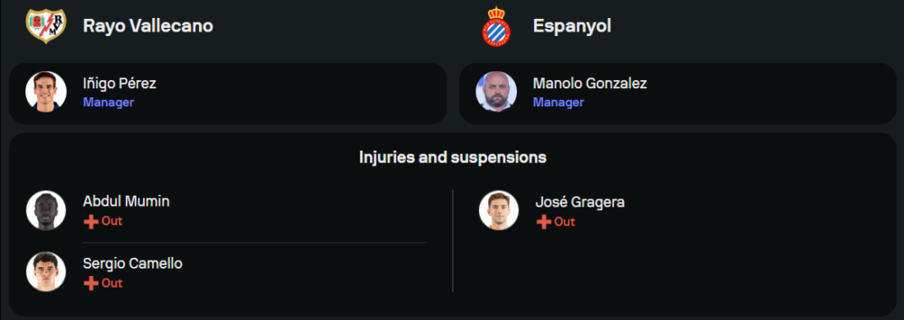 ราโย่ บาเยกาโน่ ของกุนซือ อินญิโก้ เปเรซ เพิ่งปลดล็อกคว้าชัยแบบสุดแกร่งเหนือ อลาเบส 2-0 เรียกความมั่นใจกลับมาได้พอสมควร ความพร้อมในเกมนี้ถือว่าใกล้เคียงสมบูรณ์ โดยจะได้ตัว ฟลอริย็อง เลอฌวน กลับมาจากโทษแบน ประจำการในแนวรับ ส่วน อับดุล มูมิน ยังไม่ฟิต ต้องพักต่อไป การจัดทัพยังคงใช้สูตร 4-2-3-1 โดยมี แรนดี้ เอ็นเตก้า เป็นหัวหอกตัวเป้า ส่วนสามแนวรุกที่สนับสนุนมีทั้ง ฆอร์เก้ เด ฟรูตอส, เปโดร ดิอาซ และ อัลบาโร่ การ์เซีย พร้อมลงล่าตาข่ายเต็มสูบ