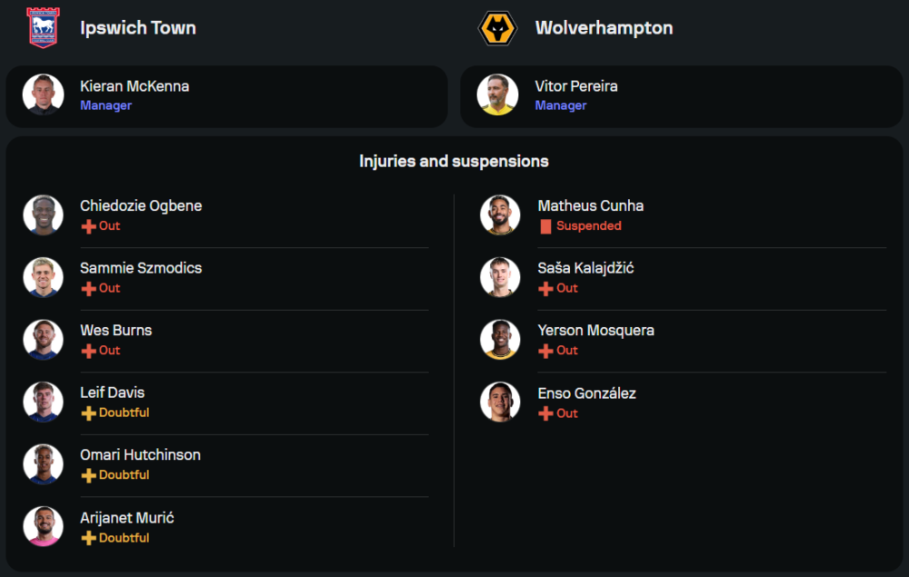 หมาป่าเริ่มกลับเข้าฝั่งหลังโชว์ฟอร์มไร้พ่าย 3 นัดหลังในลีก เกมเยือนก็ดูดีกว่าที่เคย โดยเก็บชัยไปถึง 2 จาก 3 นัดหลัง แม้จะมีรอยรั่วบ้างในเกมรับ แต่แนวรุกของพวกเขามีทีเด็ดให้ลุ้นทุกจังหวะ ยิ่งเมื่อต้องเจอกับแนวรับที่เปราะบางของอิปสวิช โอกาสบุกเก็บสามแต้มจึงมีไม่น้อย