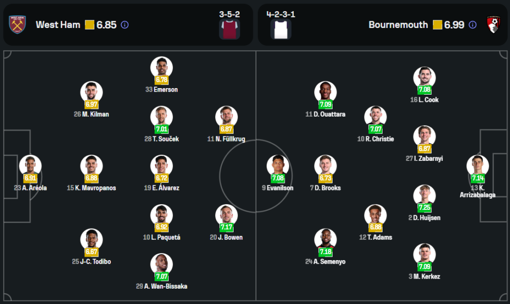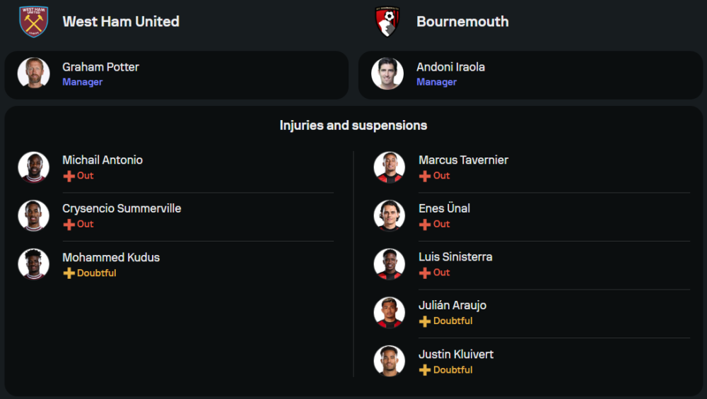 กุนซือ เกรแฮม พ็อตเตอร์ ยังคงเจอปัญหาเรื่องความต่อเนื่องในฟอร์มการเล่น หลังล่าสุดบุกพ่ายวูล์ฟส์ 0-1 แบบเจ็บแสบ โดยสภาพทีมล่าสุดยังไม่มีชื่อของ มิคาอิล อันโตนิโอ และ ครีเซนซิโอ้ ซัมเมอร์วิลล์ ที่ยังเจ็บยาว ขณะที่ โมฮัมเหม็ด คูดุส อยู่ในข่ายรอเช็กความฟิต ระบบที่ใช้ยังคงยึด 3-5-2 วางคู่หัวหอกอย่าง จาร์ร็อด โบเว่น และ นิคลาส ฟูลล์ครู้ก เป็นตัวจบสกอร์ และใช้ เอ็ดสัน อัลวาเรซ คุมเกมแดนกลางเหมือนเดิม