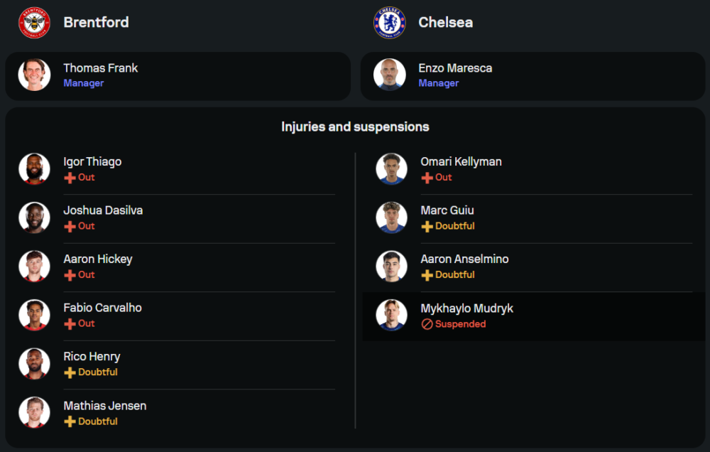 ฝั่งเจ้าถิ่น เบรนท์ฟอร์ด ของกุนซือ โธมัส แฟร้งค์ ต้องเจอกับปัญหาเดิม ๆ ที่ยังไม่จบ ทั้งการขาดหายของตัวหลักอย่าง โจชัว ดาซิลวา, อิกอร์ ธิอาโก้, ฟาบิโอ คาร์วัลโญ่ และ กุสตาโว่ นูเนส ที่ต่างพากันบาดเจ็บ ส่วน ริโก้ เฮนรี่ และ มาธิอัส เจนเซ่น ยังต้องเช็กฟิตก่อนลงสนาม ทำให้ต้องพึ่งความฟิตของแกนหลักอย่าง โยแอน วิสซ่า, บรีย็อง เอ็มโบโม่ และ เควิน เชด เพื่อปั้นเกมรุกในระบบ 4-2-3-1 หวังเปิดเกมเร็วบุกกดดันแนวรับของเชลซีให้ได้มากที่สุด