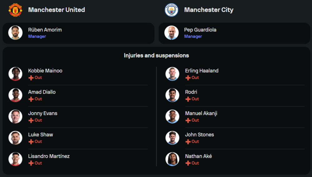 ด้านแชมป์เก่าอย่าง แมนฯ ซิตี้ ของกุนซือ เป๊ป กวาร์ดิโอล่า ฟอร์มเริ่มกระเตื้องขึ้นหลังเก็บชัย 2 เกมติด แต่ปัญหาสำคัญคืออาการบาดเจ็บของบรรดาตัวหลัก ทั้ง เออร์ลิ่ง ฮาลันด์, โรดรี้, จอห์น สโตนส์, มานูเอล อาคานยี่ และ นาธาน อาเก้ หมดสิทธิ์ลงช่วยทีมทั้งหมด ทำให้ เป๊ป ต้องพึ่งการประสานงานของ โอมาร์ มาร์มูช, ซาวินโญ่, โดกู และ โฟเด้น เป็นหลักในแผน 4-2-3-1