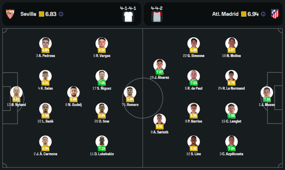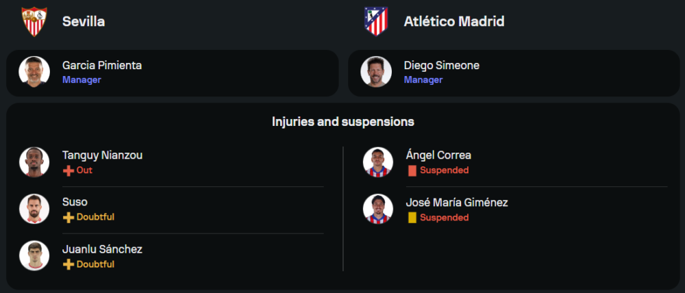 ด้านทีมเยือนของ ดีเอโก้ ซิเมโอเน่ ยังคงประสบปัญหาผู้เล่นติดโทษแบน โดยเฉพาะสองแข้งตัวหลักทั้ง โฆเซ่ กิมิเนซ แนวรับจอมบู๊ และ อังเคล กอร์เรอา แนวรุกฟ้าขาว ทำให้ต้องปรับเกมรับและแดนหน้าเล็กน้อย อย่างไรก็ตาม ด้วยขุมกำลังที่เหลือยังน่าหวัง ไม่ว่าจะเป็น ฮูเลี่ยน อัลวาเรซ, อองตวน กรีซมันน์, โรดริโก้ เด ปอล และ ปาโบล บาร์ริออส พร้อมผนึกกำลังในระบบ 4-4-2 เพื่อเป้าหมายสามคะแนนล้ำค่า