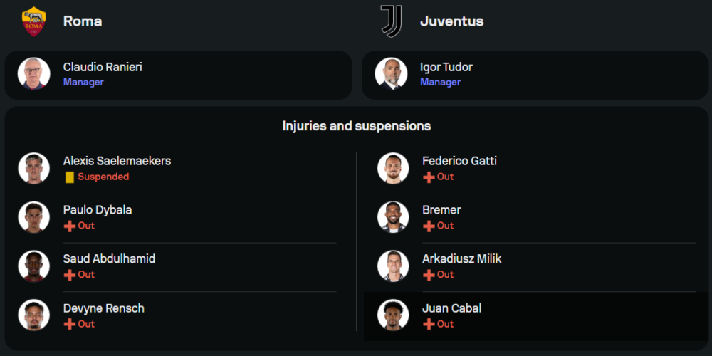 โรม่า ของกุนซือจอมเก๋า เคลาดิโอ รานิเอรี่ กำลังอยู่ในช่วงที่เรียกได้ว่า “ฟอร์มโหดจัด” คว้าชัยในลีกมาแล้วถึง 7 นัดรวด ความมั่นใจพุ่งทะลุเพดาน แม้ในเกมยุโรปจะสะดุดให้แอธ.บิลเบา แต่ในลีกยังไร้เทียมทาน อย่างไรก็ตาม เกมนี้พวกเขาจะไม่มี อเล็กซิส แซร์เลแมเกอร์ส มิดฟิลด์ตัวรุกที่ติดโทษแบน ขณะที่ เปาโล ดีบาล่า, ซาอุด อับดุลฮามิด และ เดวิน เรนช์ ยังเดี้ยงต่อเนื่อง การจัดทัพคาดว่าจะใช้แผน 3-4-2-1 โดยมี อาร์เตม ดอฟบิค รับบทกองหน้าตัวเป้า ร่วมกับ ลอเรนโซ่ เปลเลกรินี่ และ มาติอัส ซูเล่ คอยปั้นเกมอยู่ข้างหลัง ส่วนแดนกลางฝากความหวังไว้กับ เลอันโดร ปาเรเดส ที่กำลังฟอร์มแรง