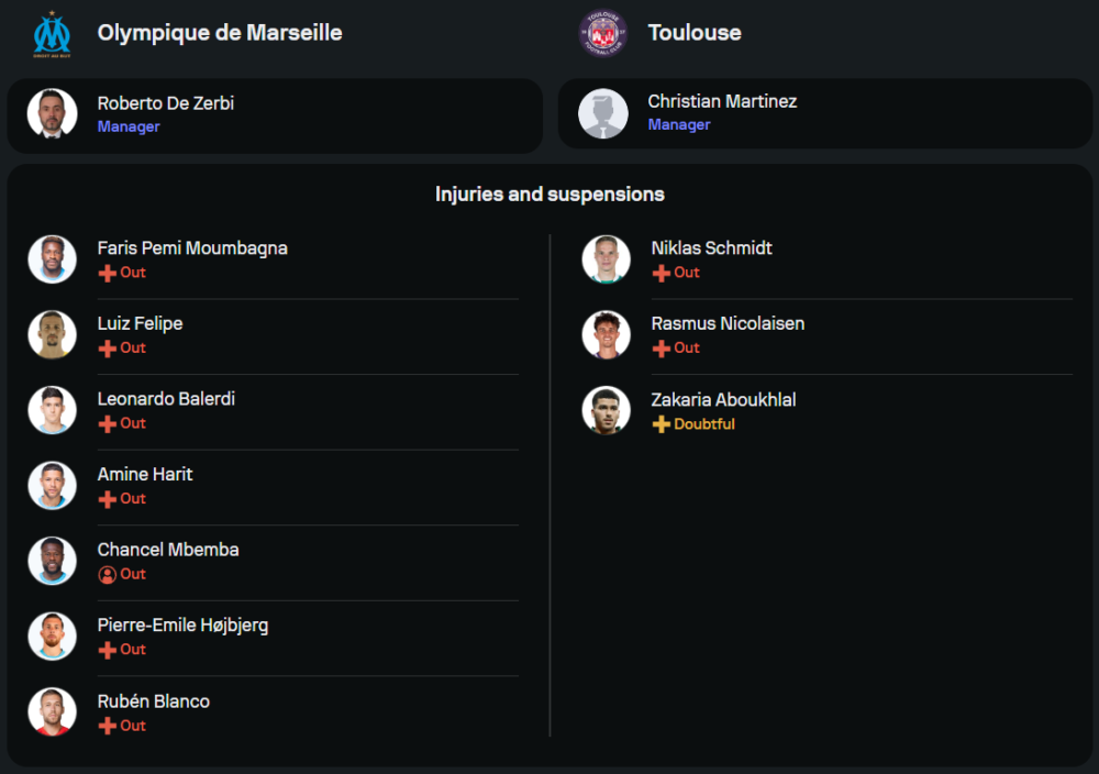 ทีมของ โรแบร์โต้ เด แซร์บี้ อยู่ในช่วงฟอร์มแกว่งพอสมควร และเจอปัญหาผู้เล่นบาดเจ็บหลายราย ไม่ว่าจะเป็น ฟาริส มูมบักญ่า, ลุยซ์ เฟลิเป้, เลโอนาร์โด้ บาแลร์ดี้, อามีน อาริต รวมถึง ชานเซล เอ็มเบมบ้า และ ปิแอร์-เอมิล ฮอยเบิร์ก ซึ่งล้วนเป็นตัวหลัก อย่างไรก็ตาม ยังพออุ่นใจได้กับแนวรุกที่มี เมสัน กรีนวู้ด และ อาเดรียน ราบิโอต์ คอยปั้นเกมหลังหัวหอกตัวเป้า อามีน กูอิรี่ พร้อมด้วยแดนกลางที่ยังมี เบนนาเซอร์ กับ รงชิเย่ร์ คุมเกม
