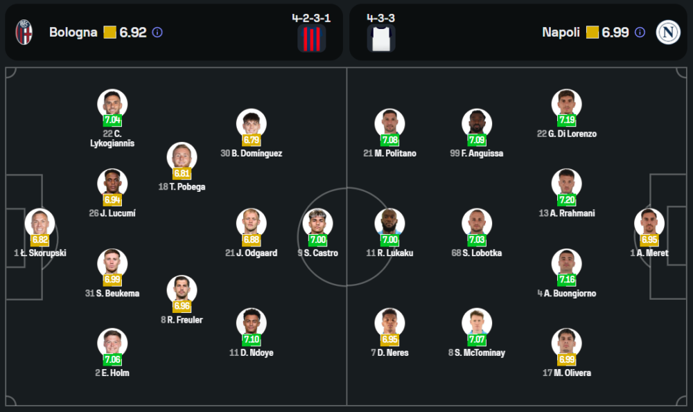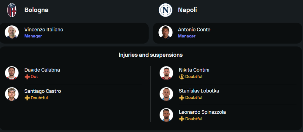 ฝั่ง นาโปลี ภายใต้การนำทัพของ อันโตนิโอ คอนเต้ ยังต้องลุ้นความฟิตของ สตานิสลาฟ โลบอตก้า และ เลโอนาร์โด สปินาซโซล่า ที่อาจไม่พร้อม 100% ขณะที่ สก็อตต์ แม็คโทมิเนย์ หายป่วยทันเวลา พร้อมลงประสานงานในแดนกลางร่วมกับ โลบอตก้า และ อองกิสซ่า ส่วนเกมรุกยังใช้สามประสานอย่าง โปลิตาโน่, ลูกากู และ เนเรส ซึ่งพร้อมท้าทายแนวรับของเจ้าถิ่นทุกเมื่อ