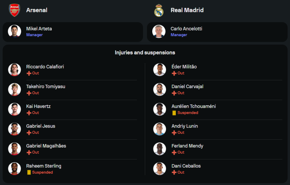 มิเกล อาร์เตต้า เฮดโค้ชของทัพ “ปืนใหญ่” ต้องปวดหัวไม่น้อยเพราะขาดแข้งหลักไปถึง 6 ราย ไล่ตั้งแต่ กาเบรียล เชซุส, ทาเคฮิโระ โตมิยาสุ, ไค ฮาแวร์ตซ์, ริคคาร์โด้ คาลาฟิโอรี่, กาเบรียล มากัลเญส และ ราฮีม สเตอร์ลิ่ง ที่ติดโทษแบน แม้จะเสียตัวหลักหลายราย แต่ข่าวดีคือได้สองแนวรุกตัวจี๊ดอย่าง บูกาโย่ ซาก้า และ กาเบรียล มาร์ติเนลลี่ หายเจ็บกลับมาช่วยทีม ขณะที่แดนกลางใช้ มาร์ติน โอเดการ์ด, ดีแคลน ไรซ์ และ โธมัส ปาร์เตย์ คุมจังหวะเกม คาดว่าจะจัดทัพในระบบ 4-3-3 พร้อมใส่เต็มเหนี่ยวทุกพื้นที่