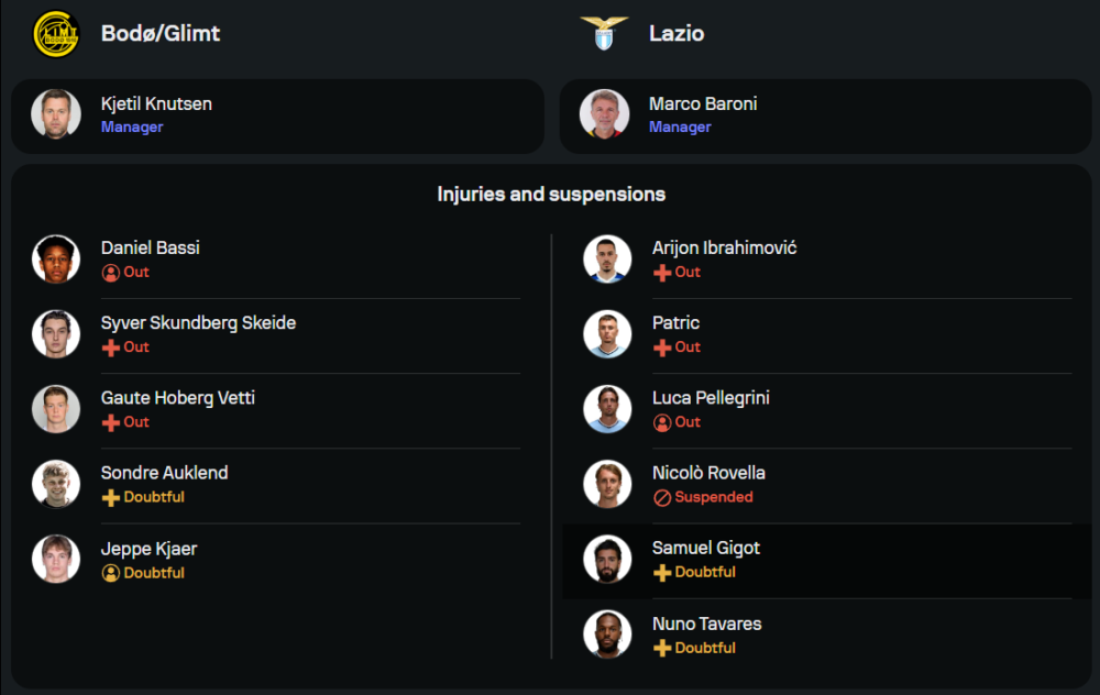 ฝั่งเจ้าบ้าน โบโด กลิมท์ ภายใต้การนำของ เคย์ติล คนุตเซ่น จะยังไม่มีชื่อ ดาเนียล บาสซี่ และสองตัวหลักอย่าง กาอูเต้ โฮเบิร์ก เว็ตติ กับ ซูเวียร์ สคุนด์เบิร์ก ที่ยังเจ็บไม่พร้อมลงช่วยทีม ส่วนที่ต้องลุ้นเช็คฟิตคือ แคสเปอร์ โฮฟ กองหน้าตัวเก่ง อย่างไรก็ตามแกนหลักอย่าง ฮากอน เอฟเยน, พาทริค เบิร์ก และ เยนส์ เฮาเก้ ยังพร้อมลงสนามเต็มพิกัด คาดว่าจะมาในระบบ 4-3-3 ตามถนัดเพื่อเปิดเกมบุกใส่ผู้มาเยือนตั้งแต่ต้นเกม