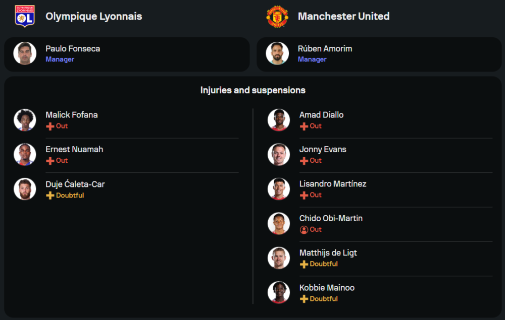 ฝั่ง แมนเชสเตอร์ ยูไนเต็ด ของกุนซือ รูเบน อาโมริม แม้จะไม่มีชื่อของ อาหมัด ดิยัลโล่, ลิซานโดร มาร์ติเนซ, จอนนี่ อีแวนส์ และดาวรุ่งอีกหลายรายที่ยังบาดเจ็บอยู่ แต่ตัวหลักอย่าง บรูโน่ แฟร์นานเดส, คาเซมิโร่ และ อเลฮานโดร การ์นาโช่ ต่างพร้อมลงสนามเต็มพิกัด โดยมี ราสมุส ฮอยลุนด์ เป็นหน้าเป้า ขณะที่แผงหลังยังใช้ แฮร์รี่ แม็กไกวร์ เป็นผู้นำร่วมกับ นูสแซร์ มาซราอุย และ เลนี่ โยโร่ เกมนี้มาในแผน 3-4-2-1 ที่เน้นเกมรุกจากวิงแบ็กทั้งสองฝั่งอย่าง ดิโอโก้ ดาโลต์ และ พาทริค ดอร์กู