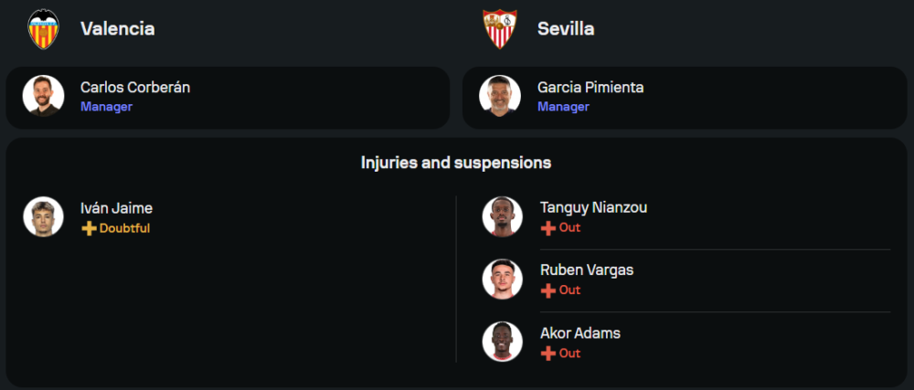 เซบีย่า ของเทรนเนอร์ การ์เซีย ปิเมียนต้า ยังต้องปวดหัวกับขุมกำลังที่ไม่สมบูรณ์ โดยมีทั้ง ต็องกีย์ เนียนซู, รูเบน วาร์กัส และ อากอร์ อดัม ที่บาดเจ็บหมดสิทธิ์ลงสนาม เช่นเดียวกับ อาเดรีย เปโดรซ่า ที่ยังไม่พร้อมกลับมา เกมนี้ต้องพึ่งพาสามแนวรุกที่เหลืออย่าง โดดี้ ลูเคบาคิโอ, ไอแซก โรเมโร่ และ อัลเบิร์ต โลกองก้า ในระบบ 4-3-3 ซึ่งแม้จะมีสปีดบอลสูง แต่เกมรับที่เปราะบางก็ยังคงเป็นปัญหาใหญ่