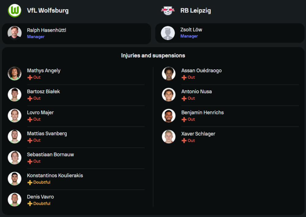 ฝั่งทีมเยือน แอร์เบ ไลป์ซิก ของกุนซือป้ายแดง โซลท์ โลว์ พึ่งคว้าชัยเหนือฮอฟเฟ่นไฮม์ 3-1 ในนัดล่าสุด เรียกความมั่นใจกลับมาได้พอสมควร แม้ก่อนหน้านั้นจะแพ้ 2 นัดติด และตกรอบเดเอฟเบ โพคาล คาดว่าไลน์อัพยังคงยึด 11 คนจากเกมล่าสุด โดยมี ลูอิส โอเปนด้า และ เบนยามิน เชสโก้ เป็นคู่หอก ขณะที่แผงกลางได้ ชาวี ซิมงส์ และ อาร์ตูร์ เฟอร์มีเรน คอยเดินเกม ด้านเกมรับแม้จะขาด เบนยามิน เฮนริคส์ แต่ยังมี วิลลี่ ออร์บาน เป็นหัวใจหลักคุมแผงหลัง