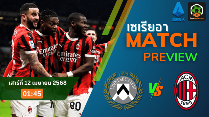 ศึกเซเรียอาอิตาลีค่ำคืนวันเสาร์นี้เป็นอีกหนึ่งเกมที่คอบอลห้ามพลาด เมื่อ อูดิเนเซ่ เตรียมเปิดรังรับการมาเยือนของ เอซี มิลาน ที่กำลังอยู่ในช่วงแผ่วปลาย ฤดูกาลเริ่มเข้าสู่ช่วงโค้งสุดท้าย ทำให้สามแต้มในเกมนี้อาจกลายเป็นจุดเปลี่ยนสำคัญของทั้งสองสโมสร โดยเกมนี้จะแข่งขันกันในคืนวันเสาร์ที่ 12 เมษายน 2568 เวลา 01.45 น. ตามเวลาในประเทศไทย ตามโปรแกรม ตารางบอลวันนี้ ที่มีหลายคู่เด็ดให้แฟนลูกหนังได้ติดตามแบบห้ามกระพริบตา