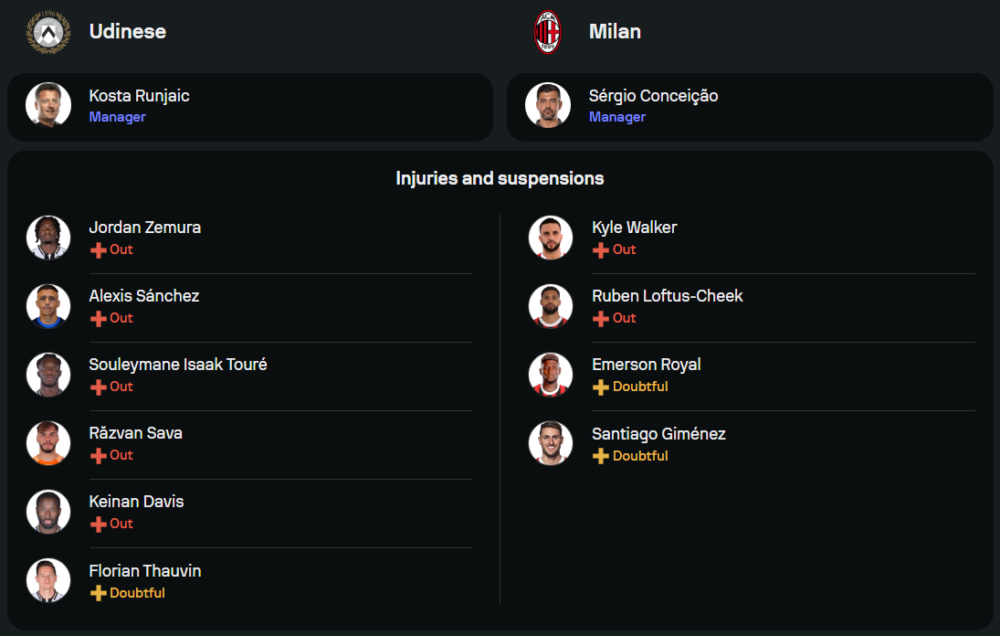 ฝั่งทีมเยือน เอซี มิลาน ที่คุมทีมโดย แซร์โจ้ คอนไซเซา ยังต้องการแต้มเพื่อไล่ล่าพื้นที่แชมเปี้ยนส์ลีก แต่ผลงานล่าสุดถือว่าขาดความสม่ำเสมอ สภาพทีมในเกมนี้ยังไม่มี ไคล์ วอล์คเกอร์, รูเบน ลอฟตัส-ชีค และ เอเมอร์สัน รอยัล ที่ยังไม่พร้อม ด้านระบบยังคงยึด 4-2-3-1 โดยใช้ แท็มมี่ อบราฮัม เป็นหน้าเป้า ขนาบข้างด้วย คริสเตียน พูลิซิช และ ราฟาเอล เลเอา ขณะที่แดนกลางมี ทิยานี่ ไรย์นเดอร์ส ประสานงานกับ ยูสซูฟ โฟฟานา และ ยูนุส มูซาห์ คุมเกมในแดนกลาง