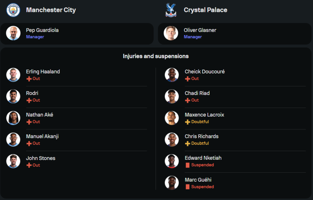 ฝั่งเจ้าบ้าน แมนฯ ซิตี้ ของ เป๊ป กวาร์ดิโอล่า เจอปัญหาใหญ่ในแง่ตัวผู้เล่น เพราะหมดสิทธิ์ใช้งานแข้งหลักถึง 5 ราย โดยเฉพาะชื่อของ เออร์ลิ่ง ฮาลันด์ และ โรดรี้ ที่เป็นหัวใจสำคัญของทีม ส่วนในแนวรับยังไร้เงา อาคานยี่, สโตนส์ และ อาเก้ ที่เจ็บยกแพ็ค อย่างไรก็ตาม เป๊ปยังมีขุมกำลังที่ไว้ใจได้หลายราย แผนการเล่นน่าจะเป็น 4-2-3-1 โดยวาง โอมาร์ มาร์มูช เป็นหน้าเป้า ส่วนสามแนวรุกประกอบด้วย โดกู, กรีลิช และ กุนโดกาน ที่พร้อมกระชากแนวรับคู่แข่งให้กระจุย