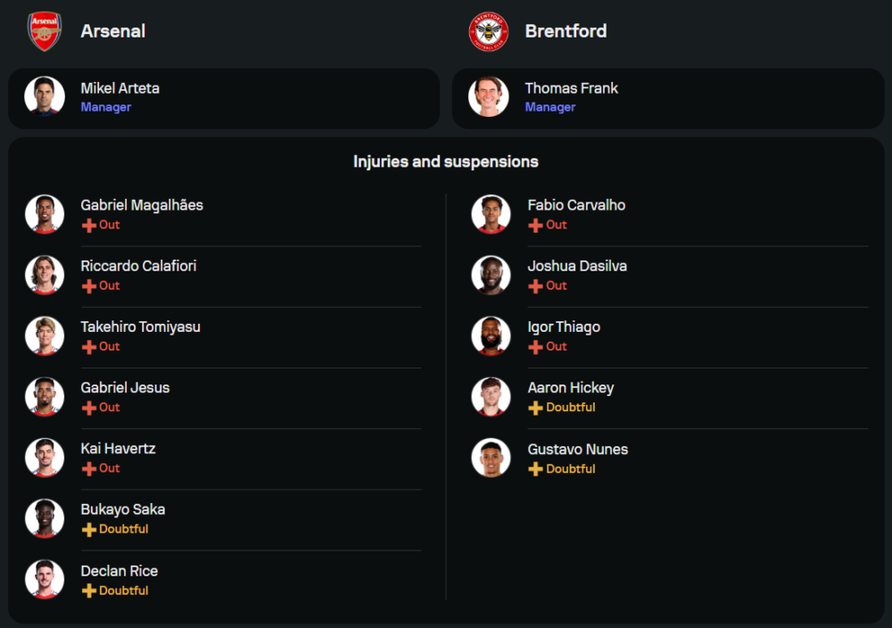 ลูกทีมของ มิเกล อาร์เตต้า อยู่ในช่วงขาขึ้นสุดๆ หลังเปิดบ้านถล่มเรอัล มาดริดไปแบบขาดลอย 3-0 ทำให้ขวัญกำลังใจและสภาพทีมอยู่ในจุดสูงสุด อย่างไรก็ตาม พวกเขายังต้องปวดหัวกับปัญหาผู้เล่นบาดเจ็บเพียบ ไล่ตั้งแต่ กาเบรียล มากัลเญส, ทาเคฮิโระ โตมิยาสุ, กาเบรียล เฮซุส, ไค ฮาแวร์ตซ์, ริคคาร์โด้ คาลาฟิโอรี่ และยังต้องรอเช็คฟิต บูคาโย่ ซาก้า กับ เดแคลน ไรซ์ ทำให้ต้องปรับทีมต่อเนื่อง โดยมีความเป็นไปได้สูงว่าจะส่ง อีธาน เอ็นวาเนรี่, เลอันโดร ทรอสซาร์ และ ราฮีม สเตอร์ลิ่ง เป็นสามประสานในแดนหน้า ขณะที่กลางสนามยังไว้ใจ มาร์ติน โอเดการ์ด คุมจังหวะเกมร่วมกับ มิเกล เมริโน่ และ จอร์จินโญ่