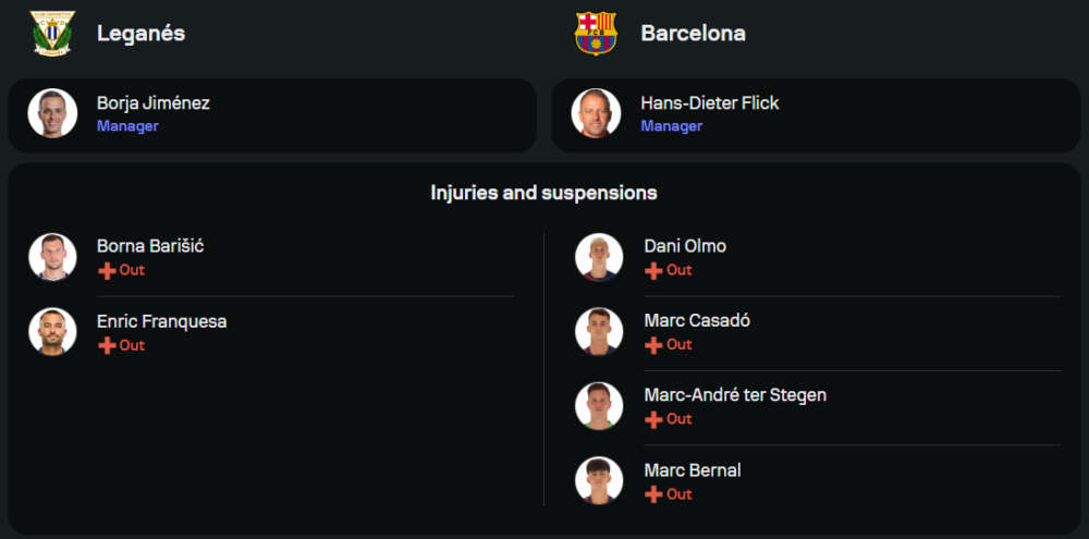 เลกาเนส ของกุนซือ บอร์ฆา ฆิเมเนซ เจอกับสถานการณ์ทีมที่ไม่ค่อยน่าพิสมัยนัก เพราะยังไร้เงาสองแข้งเกมรับสำคัญอย่าง บอร์น่า บาริซิช และ เอ็นริก ฟรานเกวซ่า ที่ยังเดี้ยงต่อเนื่อง แม้ได้ ออสการ์ โรดริเกซ พ้นโทษแบนกลับมา แต่ดูเหมือนจะยังไม่ถูกส่งลงตัวจริง เกมนี้จะยังฝากความหวังไว้ที่สามประสานแนวรุกอย่าง ฆวน ครูซ, ดานี่ ราบา และหัวหอกตัวเป้า ดีเอโก้ การ์เซีย ซึ่งยังต้องพิสูจน์ว่าพอจะทะลวงแนวรับบาร์ซ่าได้หรือไม่