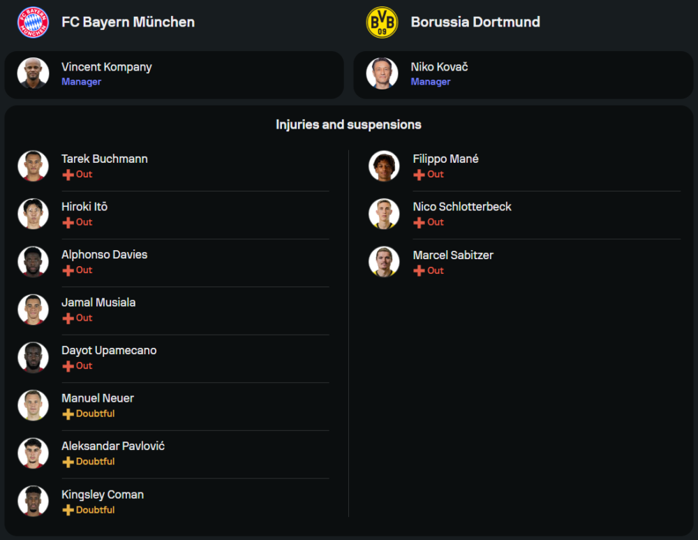 บาเยิร์น มิวนิค ลูกทีมของ แว็งซ็องต์ ก็อมปานี เพิ่งโดน อินเตอร์ มิลาน บุกอัดคาบ้าน 1-2 ในศึกยูฟ่า แชมเปี้ยนส์ ลีก ทำให้ความมั่นใจกระตุกนิดหน่อยก่อนเข้าสู่เกมสำคัญอีกหนึ่งนัดในลีก สำหรับความพร้อมเกมนี้ พวกเขายังต้องขาดผู้เล่นหลักหลายราย โดยเฉพาะ ยามาล มูเซียล่า เพลย์เมกเกอร์ดาวรุ่งที่เจ็บกล้ามเนื้อ รวมถึงกองหลังและผู้รักษาประตูอย่าง มานูเอล นอยเออร์ และ ดาโยต์ อูปาเมกาโน่ ที่ยังไม่พร้อมใช้ การจัดทัพจึงต้องฝากความหวังไว้ที่ แฮร์รี่ เคน หัวหอกเบอร์หนึ่งของทีม ที่ยิงไปแล้ว 23 ลูกในลีก พร้อมผนึกกำลังกับ ไมเคิ่ล โอลิเซ่ และ เซิร์จ นาบรี้ ในแนวรุก ส่วนแดนกลางจะได้ โยชัว คิมมิค ประคองเกมร่วมกับ เปาลินญ่า
