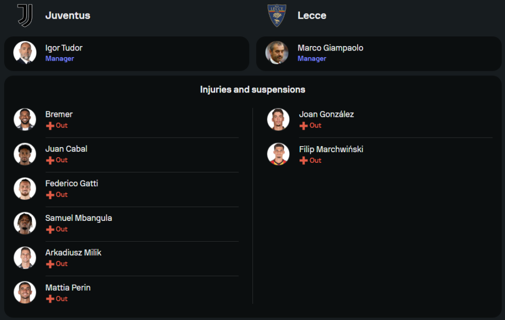 ยูเวนตุสอิกอร์ ทูดอร์ นายใหญ่คนใหม่ของทัพ “ม้าลาย” เริ่มต้นชีวิตใหม่ในถิ่นตูรินได้ไม่เลว 2 นัดเก็บได้ถึง 4 แต้ม เกมล่าสุดบุกไปเสมอโรม่า 1-1 แบบน่าพอใจ ด้านสภาพความพร้อมแม้จะไร้แข้งสำคัญหลายราย โดยเฉพาะแนวรับที่ไร้ชื่อของ เบรเมอร์, กัตติ และคาบัล แต่ขุมกำลังตัวหลักยังอยู่ครบ โดยมี เคนาน ยิลดิซ และ นิโคลัส กอนซาเลซ ปั้นเกมรุกอยู่ด้านหลัง ดูซาน วลาโฮวิช ที่พร้อมล่าตาข่ายเช่นเคย ด้านแผนการเล่นยังคงยึดระบบ 3-4-2-1 เช่นเดิม