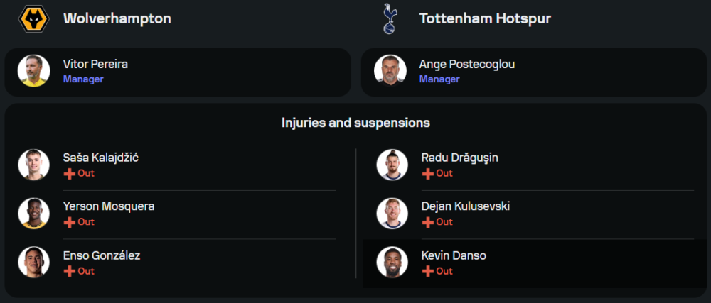 วูล์ฟแฮมป์ตัน ของกุนซือ วิตอร์ เปไรร่า กำลังมั่นใจสุดขีดหลังคว้าชัยในเกมลีกมา 3 นัดติด พวกเขาได้ มาเธอุส คุนญ่า กลับมาจากโทษแบน พร้อมลงสนามทันที ส่วนนักเตะที่ยังไม่ฟิตสมบูรณ์อย่าง เยร์สัน มอสเกอร่า, ซาซ่า คาลายด์ซิช, เอ็นโซ่ กอนซาเลซ และ เลออน ชิโวม ยังหมดสิทธิ์ลงช่วยทีม ทว่า 11 ตัวจริงยังดูแน่นทุกจุด โดยเฉพาะในระบบ 3-4-2-1 ที่ใช้ ยอร์เก้น สตรานด์ ลาร์เซ่น ยืนค้ำแดนหน้า ขนาบด้วยสองจอมเทคนิคอย่าง ฌ็อง-ริกเนอร์ เบลล์การ์ด และ มาร์แชลล์ มูเน็ตซี่ ที่พร้อมปล่อยของ