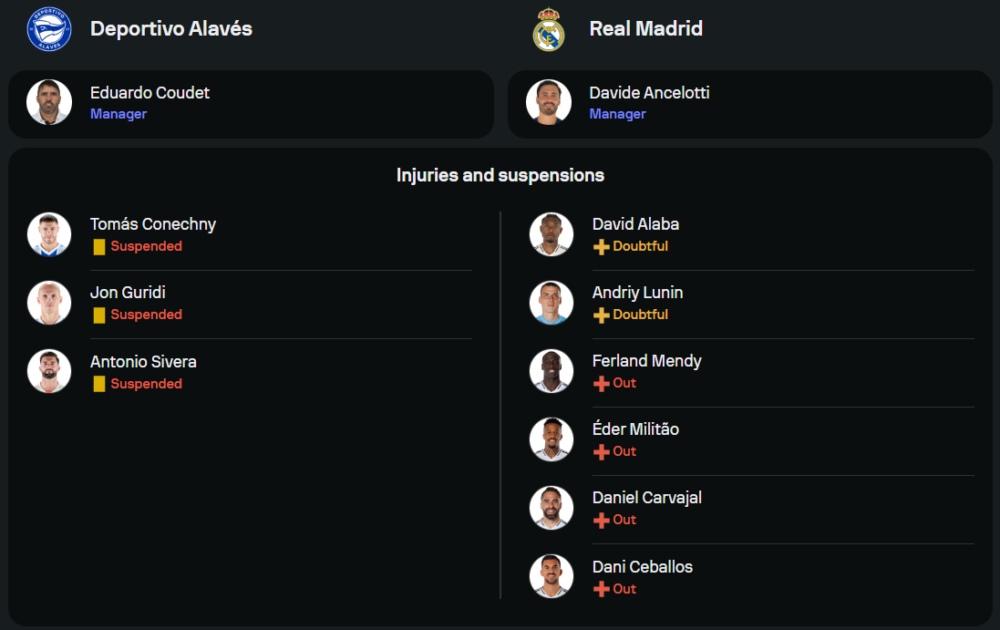 ฝั่งเจ้าบ้าน อลาเบส ของกุนซือ เอดูอาร์โด้ โคอูเด็ต แม้เพิ่งปลุกชีพคว้า 3 แต้มสำคัญจากเกมเยือน กิโรน่า ได้ในนัดล่าสุด แต่ปัญหาใหญ่คือขุมกำลังในวันนี้ติดโทษแบนถึง 3 รายรวด ทั้งนายด่านมือหนึ่ง อันโตนิโอ ซิบร่า, กองกลางตัวหลัก ฆอน กูริดี้ และ โตมาส โกเนชนี่ ตัวรุกฝีเท้าจัด ต้องส่ง เฆซุส โอโวโน่ นายด่านมือรองลงสนาม ส่วนแนวรุกยังไว้ใจ กิเก้ การ์เซีย ยืนค้ำกับ การ์ลอส มาร์ติน ตามแผน 4-4-2