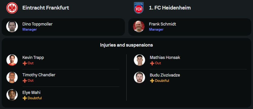 ลูกทีมของ ดิโน่ ท็อปป์เมิลเลอร์ เพิ่งบุกไปยันเสมอสเปอร์ส 1-1 ในศึกยูโรป้าลีกช่วงกลางสัปดาห์ สภาพร่างกายจึงอาจมีอาการล้าให้เห็นบ้าง และคาดว่าจะมีการหมุนเวียนผู้เล่นบางตำแหน่ง แต่ตัวหลักหลายรายยังพร้อมลงสนาม นำโดย อูโก้ เอคิติเก้ ที่ฟอร์มแรงซัดไปแล้ว 13 ประตูในลีก ขนาบข้างด้วย บาโฮย่า และ มาริโอ เกิตเซ่ ในแผน 4-2-3-1 ขณะที่แผงกลางใช้ เอลล์เยส สคิห์รี่ และ ออสการ์ ฮอยลุนด์ คอยคุมจังหวะเกม