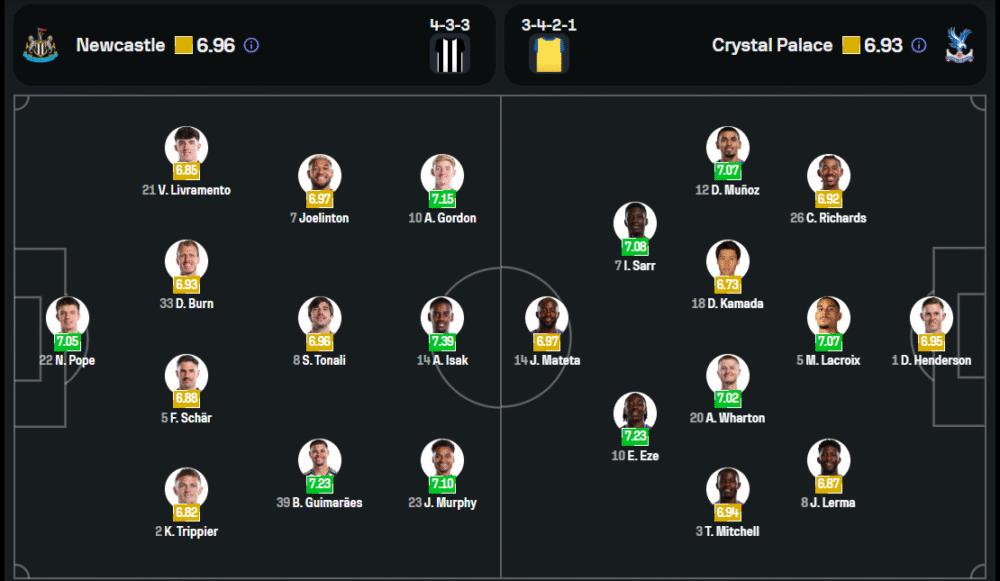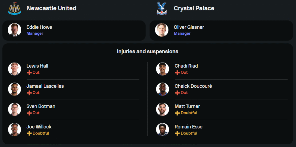 นิวคาสเซิ่ล ยูไนเต็ด ภายใต้การคุมทีมของ เอ็ดดี้ ฮาว ยังคงต้องขาดแกนหลักบางรายที่ยังบาดเจ็บ ทั้ง สเวน บ็อตมัน, จามาล ลาสเซลล์ส, ลูอิส ฮอลล์ และ โจเซฟ วิลล็อค ที่ยังไม่หายดี แต่ข่าวดีก็คือ แกนหลักที่เหลือพร้อมลงสนามเต็มสูบ โดยใช้แผนเก่ง 4-3-3 มี อเล็กซานเดอร์ อิซัค ยืนหน้าเป้า ขนาบข้างด้วย จาค็อบ เมอร์ฟี่ และ ฮาร์วี่ย์ บาร์นส์ แผงกลางใช้ ซานโดร โตนาลี่ คุมจังหวะร่วมกับ บรูโน่ กีมาไรส์ และ โชเอลินตอน ส่วนแนวรับวาง แดน เบิร์น กับ ฟาเบียน ชาร์ คุมเกมรับหน้า นิ๊ค โป๊ป เหมือนเดิม
