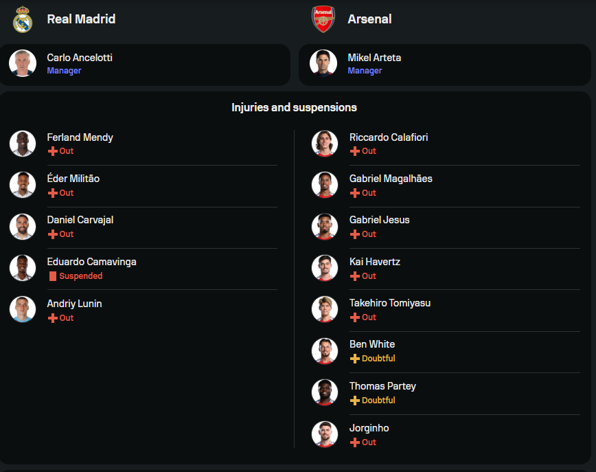 อาร์เซนอล ของ มิเกล อาร์เตต้า ก็ใช่ว่าจะสมบูรณ์ เพราะผู้เล่นตัวหลักหลายคนยังบาดเจ็บไม่ฟื้น ไม่ว่าจะเป็น กาเบรียล เฮซุส, ไค ฮาเวิร์ตซ์, ทาเคฮิโระ โตมิยาสุ, กาเบรียล มากัลเญส รวมถึงต้องเช็คฟิต โธมัส ปาร์เตย์, เบน ไวท์ และ จอร์จินโญ่ แต่ด้วยขุมกำลังชุดหลักอย่าง ซาก้า, โอเดการ์ด, ไรซ์, มาร์ตินเนลลี่ ยังอยู่ครบ ทำให้ทีมเยือนมีทีเด็ดพร้อมสวนได้ทุกเมื่อ