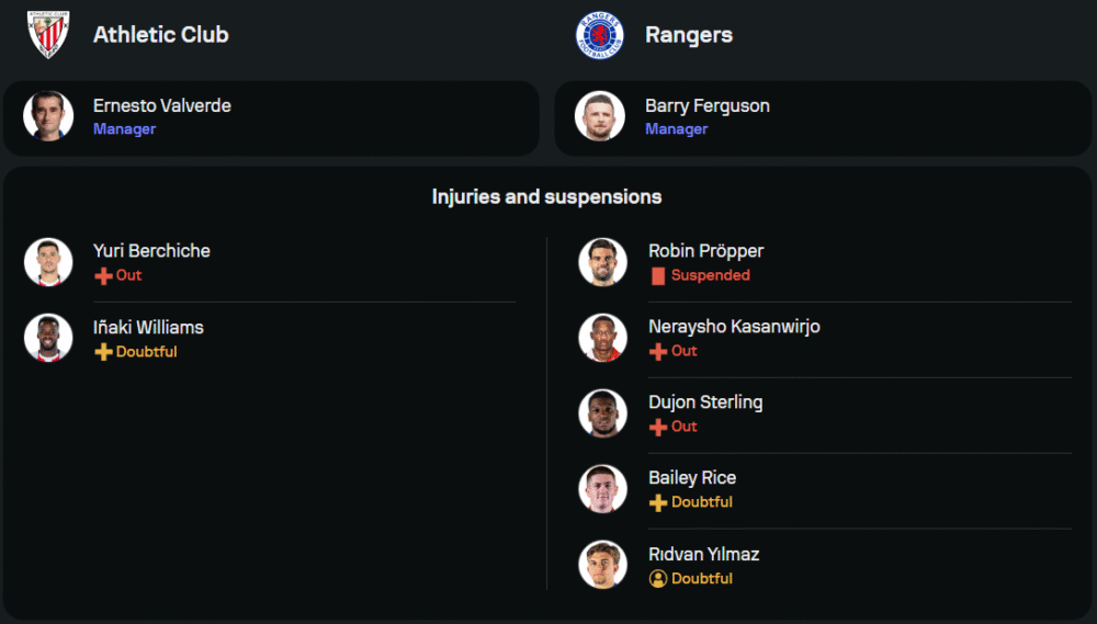 แอธเลติก บิลเบา ของกุนซือ เออร์เนสโต้ บัลเบร์เด้ มีข่าวดีพอสมควร เพราะสภาพทีมโดยรวมยังถือว่าพร้อมเกือบเต็มร้อย ขาดแค่ ยูรี เบร์ชิเช่ ที่บาดเจ็บยาว ส่วน อินญากี้ วิลเลี่ยมส์ ต้องเช็กความฟิตจนนาทีสุดท้าย แต่เกมรุกยังจัดเต็มนำโดย นิโก้ วิลเลี่ยมส์, ออยอาน ซานเซ็ต และ กอร์ก้า กูรูเซต้า ที่พร้อมสาดกระสุนในแผน 4-2-3-1