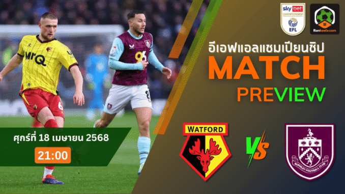 แมตช์เดือดประจำศุกร์ที่ 18 เมษายน 2568 นี้ ต้องจับตาให้ดี! วัตฟอร์ด เตรียมเปิดรังวิคาราจ โร้ด ต้อนรับการมาเยือนของ เบิร์นลี่ย์ ในศึก อีเอฟแอล แชมเปียนชิป 2025 เวลา 21:00 น. ทั้งสองทีมต่างต้องการสามแต้มเพื่อเป้าหมายที่แตกต่างกัน เจ้าถิ่นสู้สุดใจเพื่อศักดิ์ศรี ส่วนทีมเยือนหมายมั่นปั้นมือเบียดลุ้นแชมป์ ดูจากโปรแกรม ตารางบอลวันนี้ แล้ว เกมนี้มีโอกาสแตกหักสูงทีเดียว!