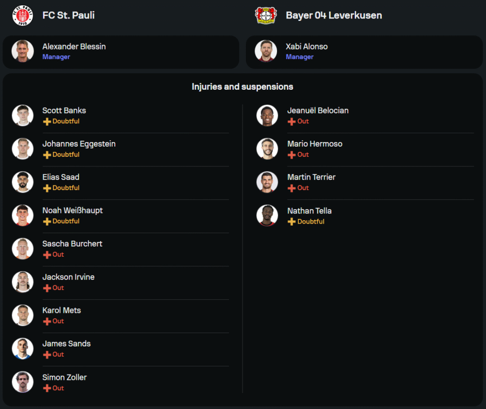 ทางฝั่งทีมเยือนของ ชาบี อลอนโซ่ เกมนี้มาแบบต้องชนะสถานเดียวเพื่อรักษาความหวังลุ้นแชมป์ สภาพทีมไม่มีปัญหาเพิ่มเติมจากเดิม ขุมกำลังหลักอย่าง ฟลอเรียน เวียร์ตซ์ ฟิตพร้อมกลับมายืนบัญชาเกมรุกเต็มสูบ ประสานงานกับ อามีน อัดลี และ ปาทริค ชิค หอกตัวเก่งที่ยิงไปแล้ว 17 ประตูในลีก งานนี้เลเวอร์คูเซ่นน่าจะจัดทัพเต็มกำลังในระบบ 3-4-2-1 เดินหน้าลุยแหลก