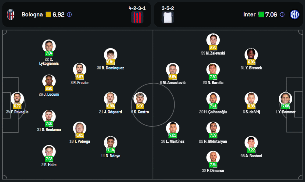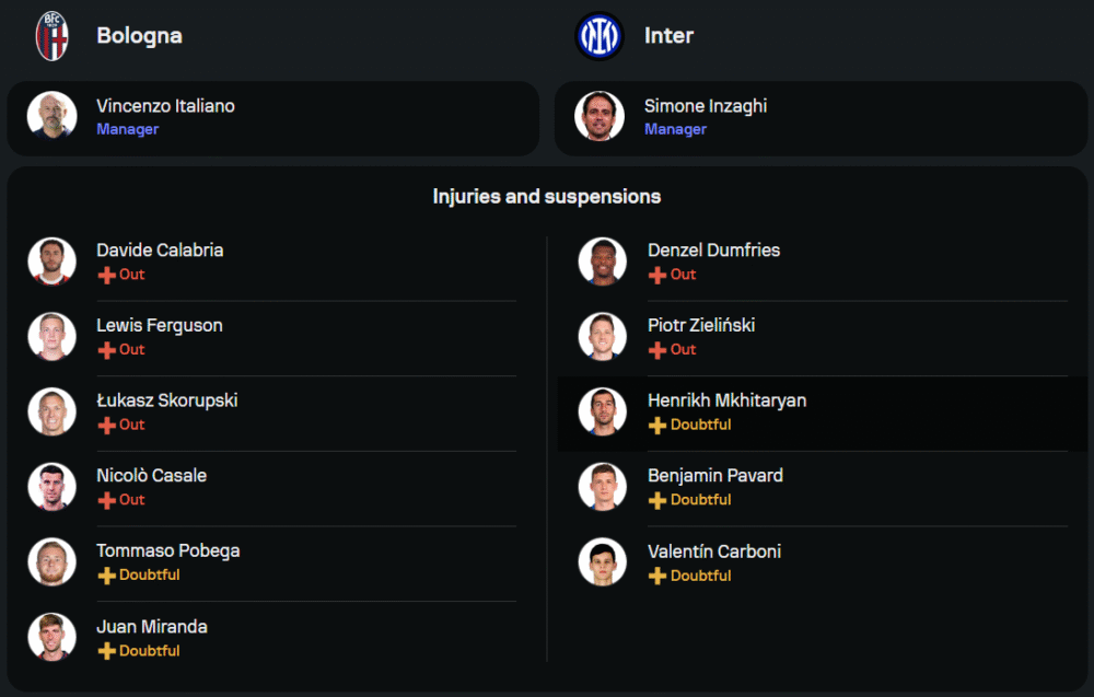 ซิโมเน่ อินซากี้ พาทีม “งูใหญ่” มาด้วยฟอร์มสุดร้อนแรง ไม่แพ้ใครมา 7 นัดติดในทุกรายการ ความพร้อมถือว่าโอเค แม้จะขาด เดนเซล ดุมฟรีส์ และ ปิโอเตอร์ ซีลินสกี้ แต่แกนหลักอย่าง นิโคโล่ บาเรลล่า, ฮาคาน ชัลฮาโนลู และ เลาตาโร่ มาร์ติเนซ พร้อมเต็มสูบ โดยเกมนี้จะวางระบบ 3-5-2 เดินเกมรุกบุกเต็มกำลัง หวังเก็บสามแต้มออกจากโบโลญญ่าให้ได้