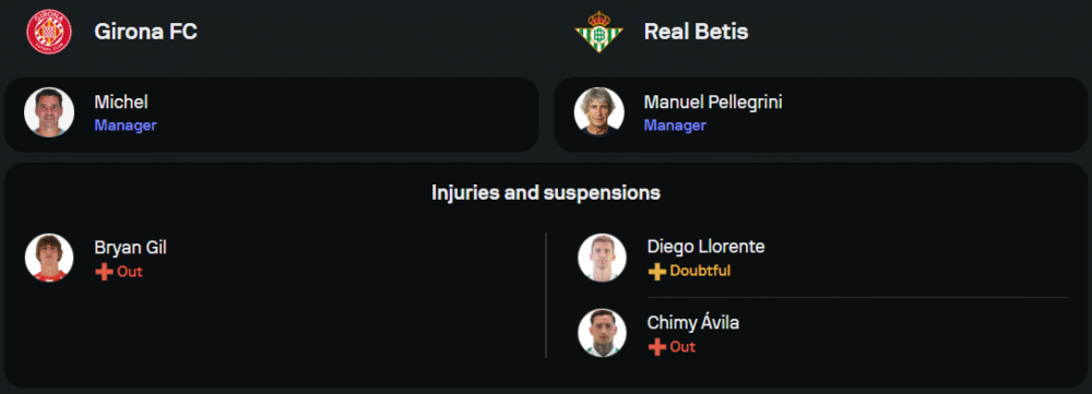 กิโรน่า ของกุนซือ มิเชล ต้องเจอปัญหาไม่น้อย โดยเฉพาะการขาด ไบรอัน กิล ที่บาดเจ็บยาว รวมถึง ริคาร์ด อาร์เตโร่ ที่ยังไม่พร้อม แต่ข่าวดีคือยังมีอาเบล รุยซ์ ยืนค้ำแดนหน้า พร้อมด้วยแผงกลางที่นำโดย อาร์ตูร์, ยังเกล เอร์เรร่า และ อิบัน มาร์ติน ที่จะคุมเกมกลางสนามในระบบ 4-5-1 หากแบ็กซ้ายอย่างมิเกล กูตีร์เรซ ฟิตไม่ทัน ดาลี่ย์ บลินด์ พร้อมเสียบแทนทันที