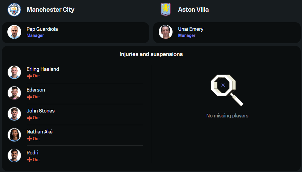 ลูกทีมของ เป๊ป กวาร์ดิโอล่า ฟอร์มเริ่มกลับมาติดลมบน แต่ปัญหาใหญ่คือสภาพทีมยังไม่ฟูลเหมือนเดิม เพราะยังขาดแข้งตัวหลักถึง 5 ราย ไล่ตั้งแต่ เออร์ลิ่ง ฮาลันด์, เอแดร์ซอน, จอห์น สโตนส์, นาธาน อาเก้ และ โรดรี้ ทั้งหมดยังอยู่ในช่วงพักฟื้น อย่างไรก็ดี ตัวเลือกที่มีอยู่ก็ถือว่าคุณภาพคับแก้ว นำมาโดย เควิน เดอ บรอยน์, รูเบน ดิอาส และ แบร์นาร์โด้ ซิลวา พร้อมลงคุมจังหวะเกมแน่นอน