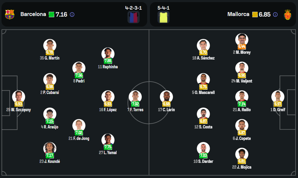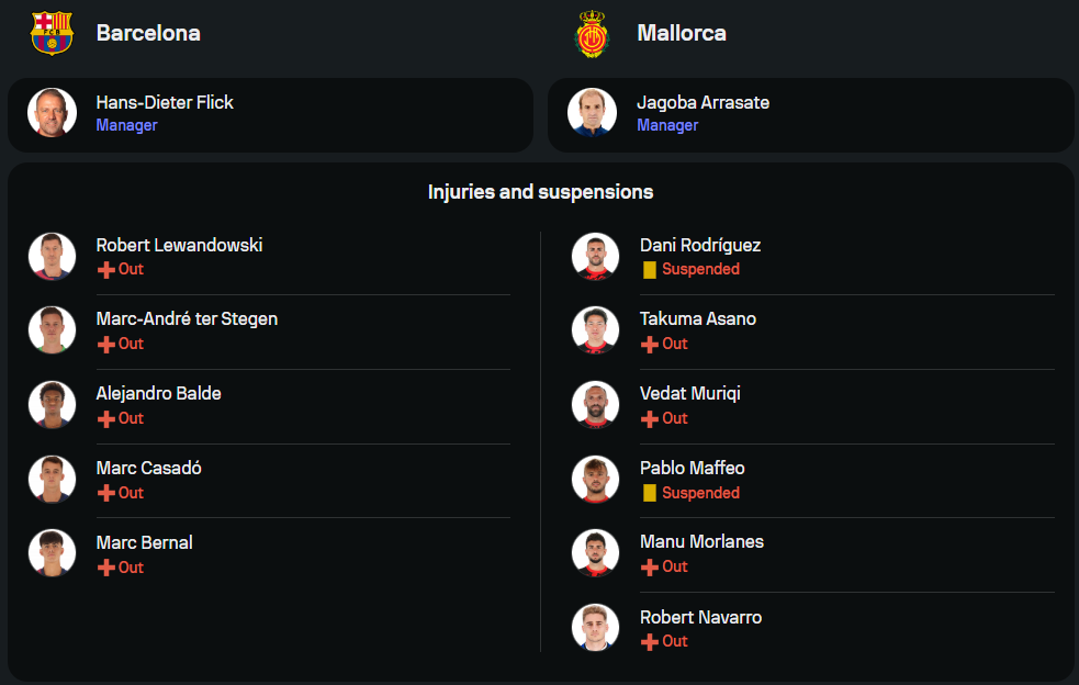 ภายใต้การคุมทัพของ ฮันส์-ดีเตอร์ ฟลิค มีปัญหาผู้เล่นบาดเจ็บอยู่พอสมควร นำโดย โรเบิร์ต เลวานดอฟสกี้, มาร์ค อังเดร แทร์ สเตเก้น, อเลฆานโดร บัลเด้, มาร์ก คาซาโด้ และ มาร์ก เบอร์นัล ทั้งหมดหมดสิทธิ์ลงช่วยทีม แต่ขุมกำลังหลักอย่าง เปดรี้, เฟรงกี้ เดอ ยอง และ ราฟินญ่า ยังอยู่กันครบ พร้อมขับเคลื่อนเกมรุกในแผน 4-2-3-1 ล่า 3 แต้มล้ำค่า