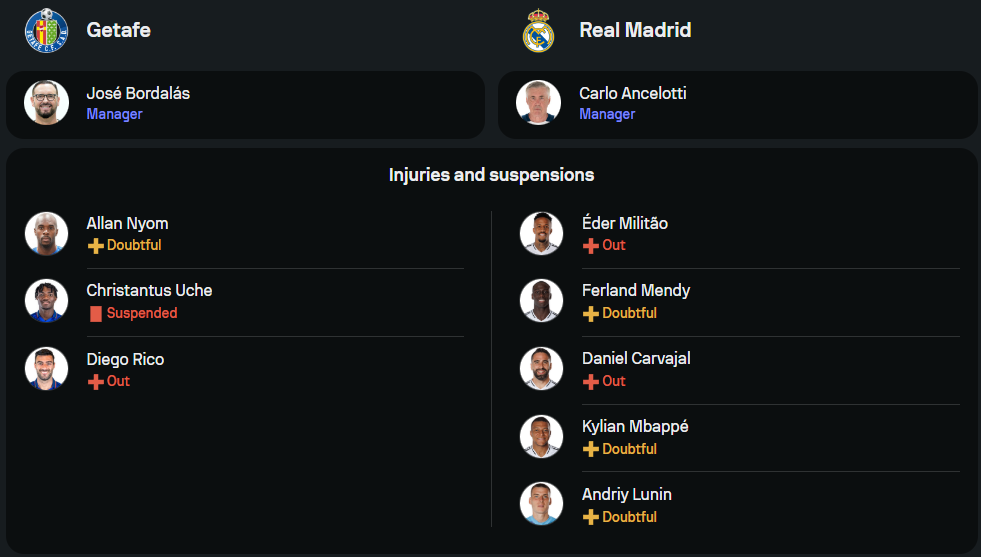 ฝั่งทีมเยือนของกุนซือ คาร์โล อันเชล็อตติ ยังเผชิญปัญหาผู้เล่นบาดเจ็บรบกวนหลายราย ไล่ตั้งแต่ ดานี่ การ์บาฆัล, เอแดร์ มิลิเตา และ แฟร์กล็องด์ เมนดี้ รวมถึงต้องเช็กฟิตดาวยิงระดับโลก คีเลียน เอ็มบัปเป้ แต่ยังดีที่ขุมกำลังหลักที่เหลือยังสมบูรณ์ดี นำทัพโดย จู๊ด เบลลิงแฮม กลางรุกฟอร์มร้อนแรง ขณะที่คู่หอกจะเป็น วินิซิอุส จูเนียร์ จับคู่กับ โรดรีโก้ พร้อมทะลวงแนวรับเจ้าถิ่น