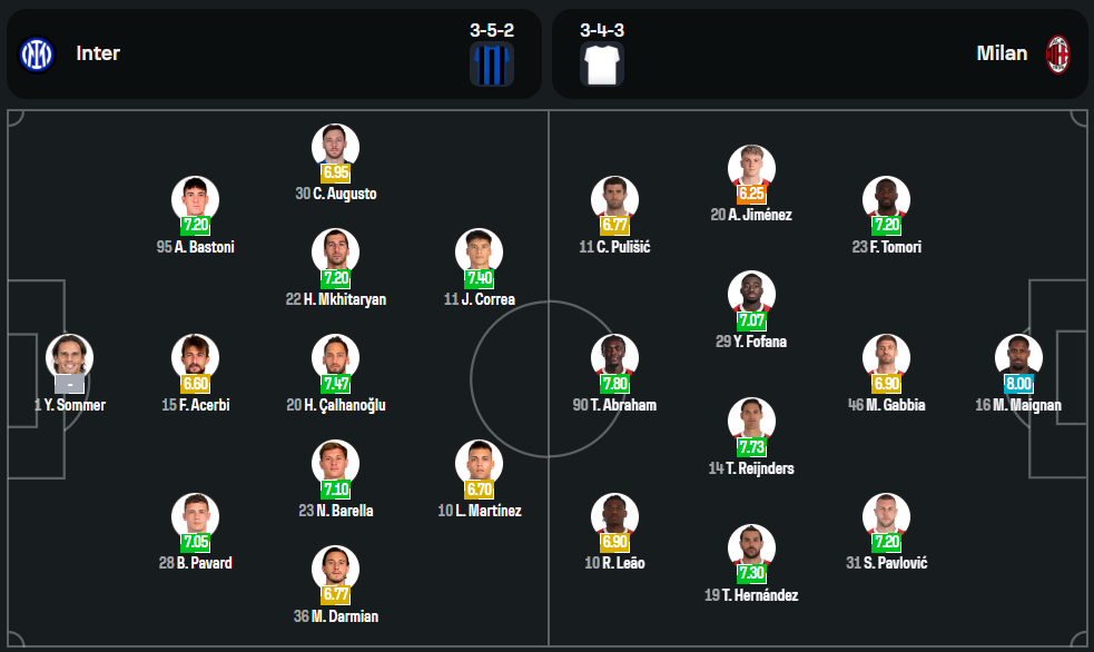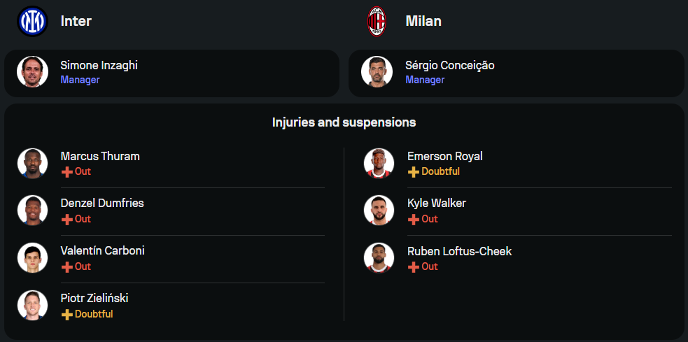 กุนซือ ซิโมเน่ อินซากี้ ต้องเผชิญกับปัญหาผู้เล่นบาดเจ็บ โดย มาร์คุส ตูราม, เดนเซล ดุมฟรีส์ และ วาเลนติน การ์โบนี่ หมดสิทธิ์ลงสนามแน่นอน ขณะที่ ปิโอเตอร์ ซีลินสกี้ ยังต้องเช็กความฟิต ข่าวดีคือขุมกำลังหลักรายอื่นยังพร้อมรบเต็มอัตรา คาดว่าจะยึดระบบ 3-5-2 โดยมี นิโคโล่ บาเรลล่า, ฮาคาน ชัลฮาโนลู และ เฮนริค มคิตาร์ยาน ขับเคลื่อนเกมกลางสนาม ขณะที่แนวรุกวาง เลาตาโร่ มาร์ติเนซ และ เมห์ดี้ ตาเรมี่ ลงล่าตาข่าย