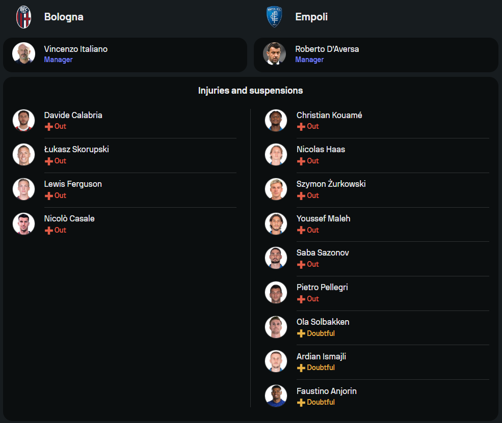 ถ้ามองในแง่ของรูปเกมและสภาพทีมตอนนี้ บอกเลยว่าทุกอย่างเทไปทาง โบโลญญ่า ชัดเจน ทั้งความมั่นใจ ฟอร์มการเล่น และการบริหารทีมของกุนซือที่ทำให้ระบบลงตัวสุดๆ แม้จะมีการโรเตชั่น แต่ก็ยังดีกว่า เอ็มโปลี ที่กำลังดิ่งลงแบบไม่มีเบรก ในมุมของ วิเคราะห์บอล บ้านกีฬา มองว่าทีมเยือนอาจจะหมดไฟในรายการนี้ และโฟกัสแค่เกมลีกเพื่อเอาตัวรอดจากโซนตกชั้นเท่านั้น ดังนั้นแมตช์นี้ไม่แปลกหากโบโลญญ่าจะย้ำแค้นอีกหน