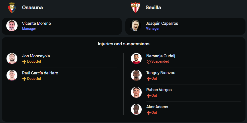 ฝั่งทีมเยือนของ ฆัวกิน กาปาร์รอส ยังเจอปัญหาตัวผู้เล่นต่อเนื่อง โดยจะขาด เนมานย่า กูเดลจ์ ที่ติดโทษแบน รวมถึงบรรดาแข้งเดี้ยงอย่าง รูเบน วาร์กัส, อากอร์ อดัมส์ และ ต็องกีย์ นิอองซู ที่ลงไม่ได้แน่นอน อย่างไรก็ตามข่าวดีคือ กิเก้ ซาลาส พ้นโทษพร้อมกลับมาเป็นตัวเลือกอีกครั้ง คาดว่าจะจัดทัพมาในระบบ 4-4-2 โดยวาง ลูเคบาคิโอ ล่าตาข่ายคู่กับ อิซัค โรเมโร่ ขณะที่แผงมิดฟิลด์ยังเป็นชุดเดิมจากเกมเสมอ อลาเบส โดยมี ซาอูล ญิเกซ กับ ซาว คุมแดนกลาง