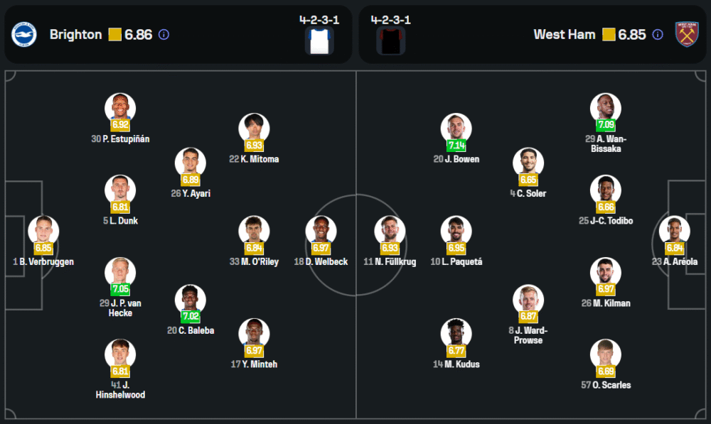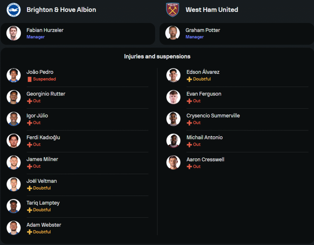 ลูกทีมของ ฟาเบียน ฮูร์เซเลอร์ ยังคงเผชิญกับปัญหานักเตะบาดเจ็บเพียบ และล่าสุดยังมาเสีย เชา เปโดร จากโทษแบนอีก ทำให้ขุมกำลังแนวรุกต้องปรับแผนกันวุ่น ตัวหลักอย่าง เวลเบ็ค, มิโตมะ และ มินเตห์ จะต้องแบกเกมบุกเต็มพิกัด เกมนี้จะเป็นบทพิสูจน์สำคัญว่าไบรท์ตันฯ จะเอาอยู่หรือไม่เมื่อไม่มีดาวซัลโวเบอร์หนึ่งลงสนาม