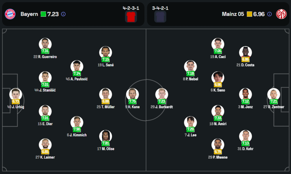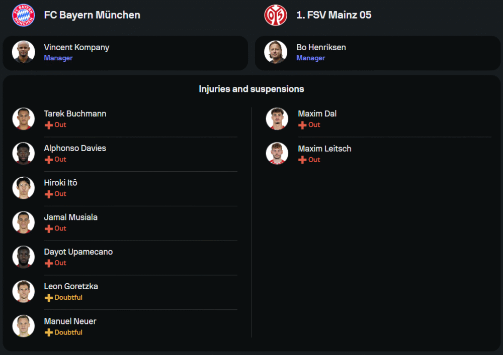 วินเซนต์ ก็อมปานี พาทีมเดินหน้าลุ้นแชมป์แบบไม่หยุด หลังเพิ่งเก็บ 3 แต้มได้อย่างสุดเฉียบจากการบุกถล่มไฮเด้นไฮม์ 4-0 เกมนี้แม้ยังไม่มีผู้เล่นตัวหลักอย่าง มานูเอล นอยเออร์, ดาโยต์ อูปาเมกาโน่, ยามาล มูเซียล่า และ อัลฟองโซ่ เดวี่ส์ แต่ขุมกำลังที่เหลือถือว่าทดแทนกันได้แบบเนียน ๆ โดยจะวาง แฮร์รี่ เคน เป็นหัวหอกตัวเป้าล่าตาข่าย โดยมี มุลเลอร์, ซาเน่ และ โอลิเซ่ ขับเคลื่อนเกมรุกอยู่ด้านหลัง เกมนี้ได้เปรียบทุกทางทั้งเกมในบ้านและแรงขับจากแฟนบอลที่ต้องการเห็นชัยชนะอย่างต่อเนื่อง