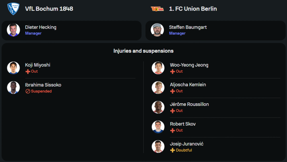 ทางฝั่ง “ยูเนี่ยน เบอร์ลิน” ภายใต้การนำของ “สเตฟเฟ่น บอมการ์ต” กำลังอยู่ในช่วงมั่นใจสุดขีด 6 นัดหลังสุดไม่แพ้ใครเลย ความพร้อมยังคงไม่มีหน้าเดิม ๆ อย่าง “ชอง วู ยอง”, “เจอโรม รุสซิญง”, “โรเบิร์ต สคอฟ” และ “อัลโยช่า เคมไลน์” ที่บาดเจ็บ แต่ขุมกำลังหลักอย่าง “อันเดรย์ อิลิช” กับ “เบเนดิกต์ โฮลเลอร์บัค” พร้อมลงสนามเต็มสูบในระบบ 3-5-2 นำโดย “เฟรเดริค รอนโนว์” นายทวารมือหนึ่งที่ยังเหนียวแน่น
