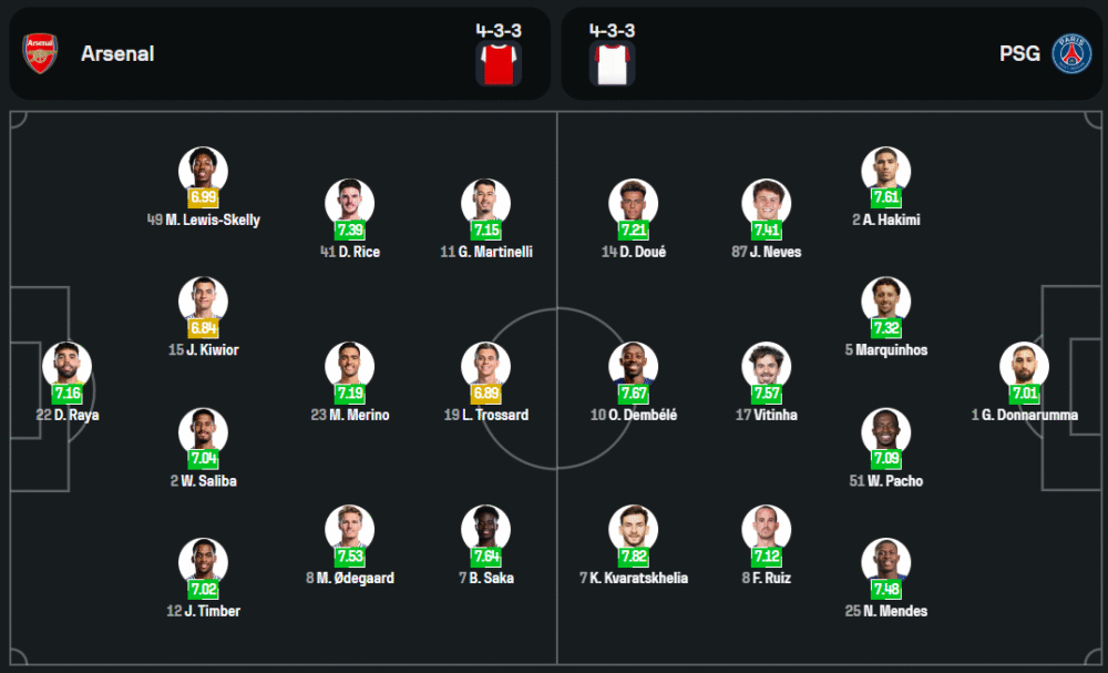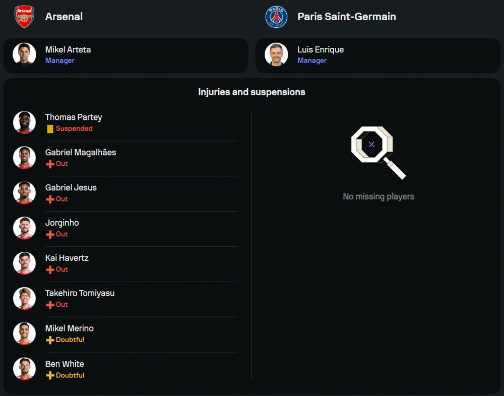 ทางด้าน เปแอสเช ของ หลุยส์ เอ็นริเก้ โชคดีไร้ตัวเจ็บหรือติดโทษแบน พร้อมจัดเต็ม 11 ตัวจริง นำทัพโดย อุสมาน เดมเบเล่, ควิช่า ควารัตสเคเลีย และ แบร็ดลีย์ บาร์โคล่า ประสานงานในแดนหน้า ขณะที่กลางสนามใช้ เจา เนเวส, ฟาเบียน รุยซ์ และ วิตินญ่า คุมจังหวะเกม โดยมี จานลุยจิ ดอนนารุมม่า เฝ้าเสา และกองหลังระดับท็อปอย่าง มาร์คินญอส กับ อาชราฟ ฮาคิมี่ นำเกมรับ