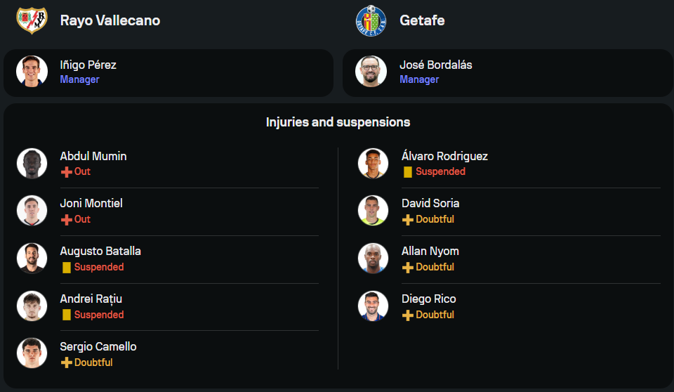 ราโย่ บาเยกาโน่ ต้องเผชิญกับปัญหานักเตะบาดเจ็บและติดโทษแบนพอสมควร ไม่ว่าจะเป็น อับดุล มูมิน, โฆนี่ มอนติเอล, ออกุสโต้ บัตตาย่า, และ อันเดร ราติอู ที่ต่างหมดสิทธิ์ลงช่วยทีม ขณะที่ เซร์คิโอ กาเมโย่ ต้องรอเช็คความฟิต ข่าวดีคือแนวรุกอย่าง ฆอร์เก้ ฟรูโตส, อิซี่ ปาลาซอน, และ อัลบาโร่ การ์เซีย พร้อมลงสนามเพื่อปั้นเกมรุกให้ แรนดี้ เอ็นเตก้า ล่าตาข่าย โดยพวกเขาจะมาในระบบ 4-2-3-1 ที่เน้นเกมรุกริมเส้นและการวางบอลลึกสู่แดนหน้า